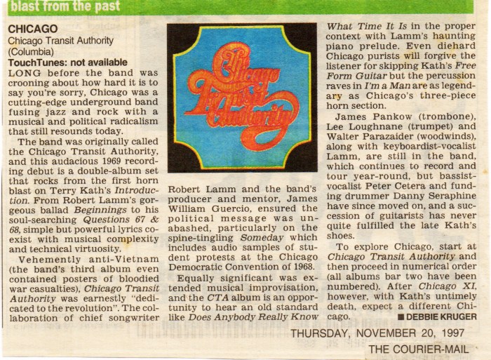 I wrote about it for a column in The Courier-Mail newspaper more than 20 years ago. It was my calling for many years back in Australia, through my journalism and my weekly radio program, to educate people about Chicago, because the band had – and still has for many – an unfair reputation as a soppy eighties power ballad band. The Rock and Roll Hall of Fame Induction three years ago put paid to that and until recently so did their live shows. Things aren’t the same nowadays, but this album will always sound exactly the way it did when it first came out on vinyl in 1969.
