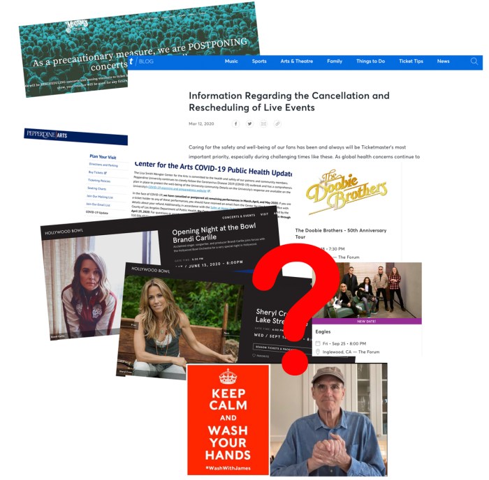 I’m not at any concert now or any time for the foreseeable future, as one by one the music events I was looking forward to – Joan Osborne at Pepperdine University’s Center for the Arts concert hall, Beth Nielsen Chapman at McCabes Guitar Shop, a Julie Andrews talk at the Skirball Cultural Center, the Eagles Hotel California shows at The Forum – were crossed off my calendar, along with other music and non-music happenings. My calendar is a mess of things crossed out. I sure hate a messy calendar.
